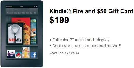 Get a $50 gift card with Kindle Fire purchase at Walmart, through 2/14/12